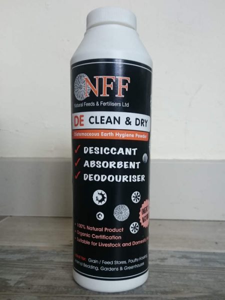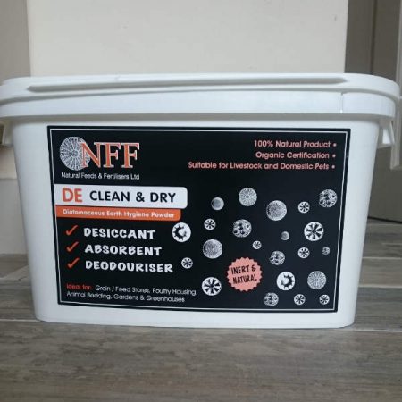DE CLEAN & DRY can be used as a dust bath to self clean or sprinkled onto animal coats, left for 24hrs and can be brushed off. It is Codex Food Grade so is safe for animals to lick themselves clean. Suitable for equines, alpacas, goats, pigs, dogs, cats, caged birds and domestic furred pets.
